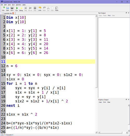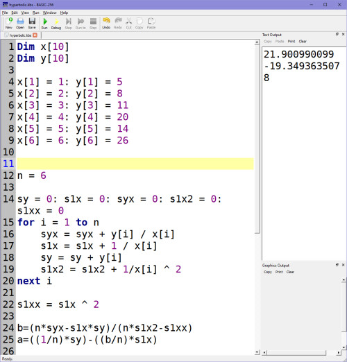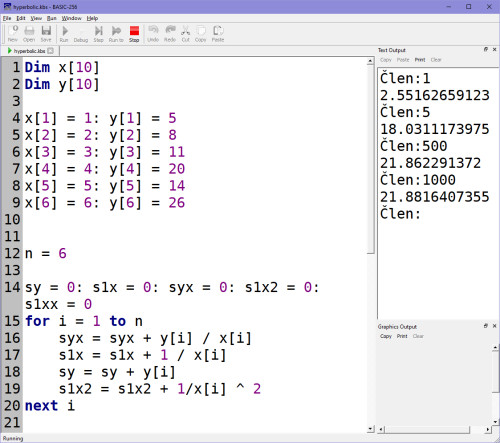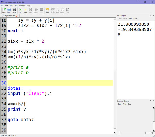 Jinými slovy vidíš, že jsme dokázali za pomoci skriptu, který vypočte koeficienty A, B pro určitou vstupní sadu dat zkonstruovat hyperbolický regresní model nad těmito daty, a se kterým můžeme dále pracovat. Zkus si třeba namísto náhodné vstupní sady 5,8,11,20,14,26 dát nějaká konkrétní čísla (třeba svou mzdu za posledních 6 měsíců) a vypočítat nad nimi hyperbolickou regresi. Dostaneš možná přesnější a zajímavější model než ti ukáže Excel ve spojnicích trendu.