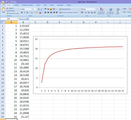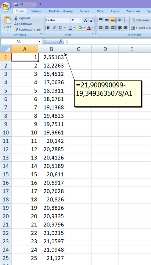 A protože jí nikde nemáme implementovanou a nemůžeme použít nějaké automatické tlačítko, zkusíme si to, co jsme teď vypočítali, zapsat do Excelu např. pro 25 vstupních dat v intervalu 1-25. V jednom sloupci budou tedy čísla 1-25, ve druhém bude vzoreček hyperbolické regrese y = A + B/x, pro který máme výsledné koeficienty