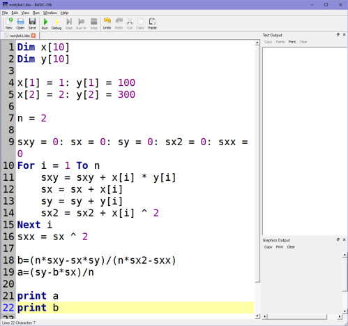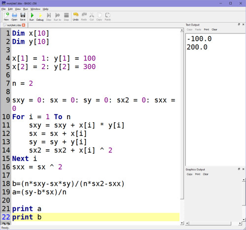 Ještě zopakuji, že zadáme do programu vstupní data polohy např.: x=1, y=100 a x=2, y=300. Podle nám už důvěrně známých vzorců spočítáme koeficienty A, B: