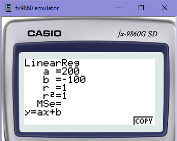 Podobný výsledek bychom dostali samozřejmě rovnou z kalkulačky, ale pro nás je podstatné, abychom regresi, tzn. koeficienty A, B, uměli spočítat sami. Můžeme ji použít ale alespoň pro kontrolu. Koneckonců na ní také vidíš, že r2=1, to znamená, že těsnost uzlových bodů k výsledné regresní přímce je rovna 1, tj. 100%. Takže motýlek, když to zjednoduším, vždy protne svým letem po přímce všechny (tj. oba) body na 100%.