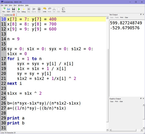 Pokud vyjdeme ze stejných uzlových bodů jako v předchozí kapitole, pak program pro výpočet koeficientů A, B pro hyperbolickou regresi bude vypadat takto: