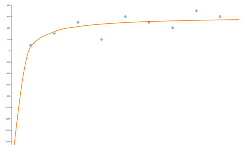 Víme, že vzorec pro Y hyperbolické regrese je Y=A+B/x. Můžeme ho tedy zapracovat do libovolného programu s dráhou motýlků. Motýlek tentokrát nejde po jednoduché trajektorii přímky, ale proletí mezi uzlovými body co nejblíže po trajektorii hyperboly. Obzvlášť patrné to může být vidět na začátku, kdy motýl vylétne po hyperbole a pak se už jen pozvolna přibližuje limitu.