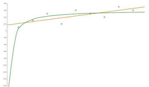 Stejným způsobem, jakým jsme zkonstruovali lineární regresi, zkonstruujeme hyperbolickou regresi, a to na předchozí případ. Nebudeme tu dělat kapitolu po kapitole praktické ukázky všech regresí, které jsme si už v minulosti ukázali, protože stejným způsobem můžeš konstruovat i další, jen se bude měnit ten vzorec pro koeficienty A, B... a výsledné Y. Ještě tedy spolu zkusme alespoň tu hyperbolickou.