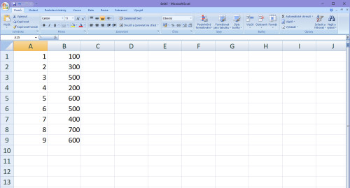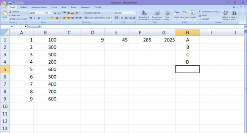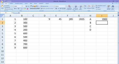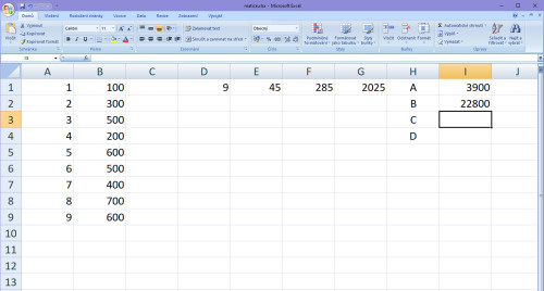 Do první buňky odshora za koeficienty, tj. do sloupce pro Y, zapíšeme prostý součet hodnot Y, v našem případě: 100+300+500+200+600+500+400+700+600 = 3900.
