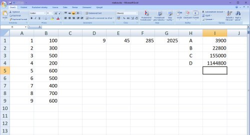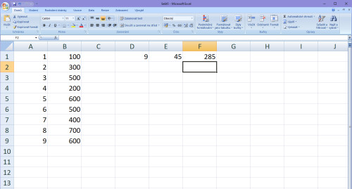 Do druhé buňky odshora zapíšeme součet součinů X a Y, v našem případě: 1x100+2x300+3x500+4x200+5x600+6x500+7x400+8x700+9x600 = 22800.