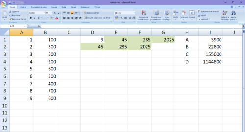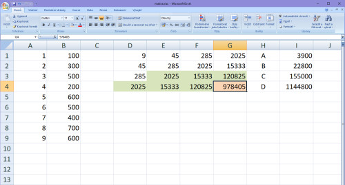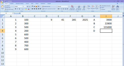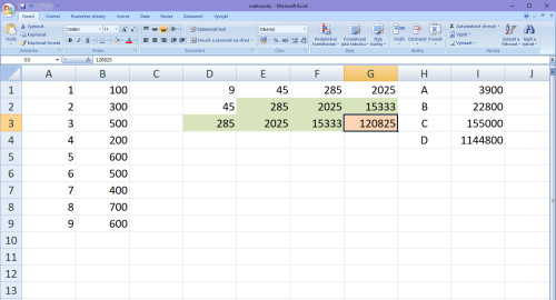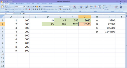 Do poslední buňky odshora v Y-části zapíšeme součet součinů X3 a Y, čili zase to stejné jako v minulém případě s tím, že namísto druhé mocniny tam bude třetí mocnina. V našem případě: 13x100+23x300+33x500+43x200+53x600+63x500+73x400+83x700+93x600 = 1144800.
