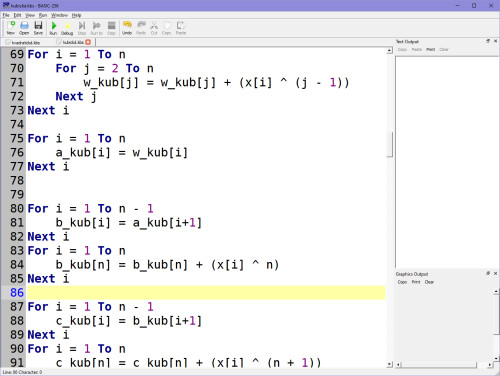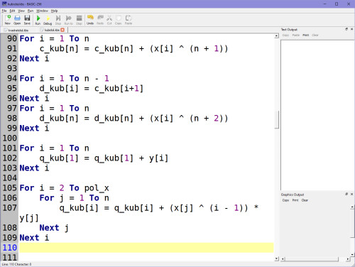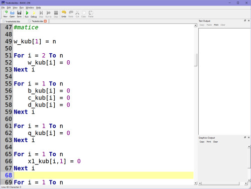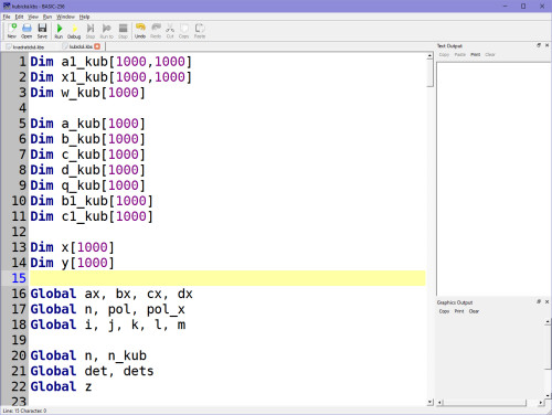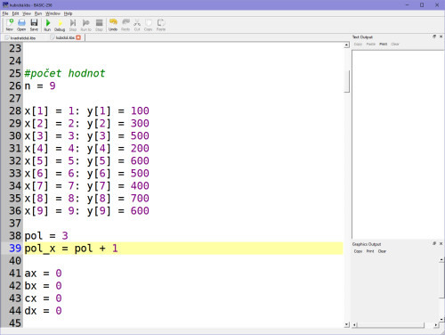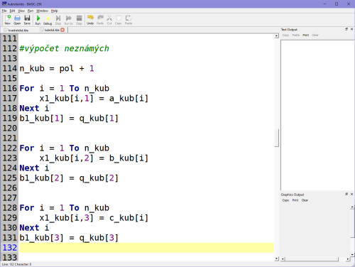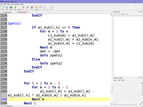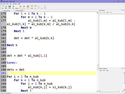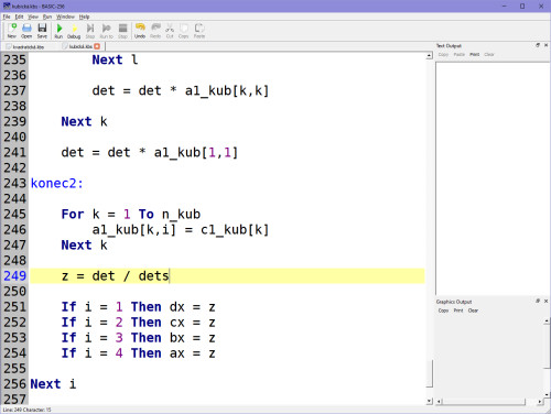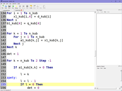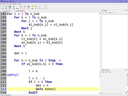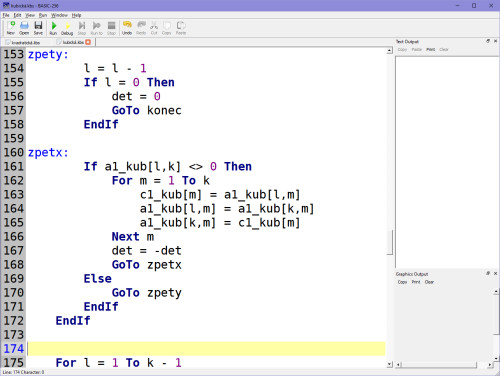 Teď si ho upravíme, aby nám vyhovoval. To znamená, že tam nemusí být dotazy na počet proměnných ani na známé X, Y... kteréžto hodnoty si dosadíme v programu přímo (nebo nějakým jiným než ručním vstupem). Můžeme také vypustit případ, že by soustava rovnic neměla jednoznačné řešení a budeme (naivně) předpokládat, že každý vstup našich dat mít řešení bude. Tím se nám to výrazně zjednoduší. A přepíšeme ho opět do Basicu-256. (Pokud nicméně porozumíš tomu, co jsme udělali v tom Excelu názorně, nemůže ti dělat problém naprogramovat to v jakémkoli jazyce.)