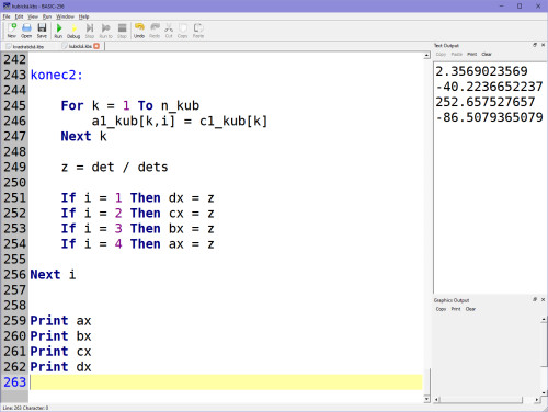 Pokud program spustíš a vypíšeš si proměnné ax, bx, cx, dx pomocí PRINT, vpravo bys měl vidět výstup - 4 hodnoty koeficientů A, B, C, D.