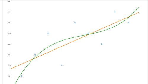 Ještě pro ilustraci, jak vypadá naše kubická regrese oproti například jednoduché lineární regresi pro tatáž data. Vidíš na ní (jak jsme si popisovali teoreticky v kapitole #3), že má 2 zlomy (tj. je to dvojitá parabola) a dostane se tak k naší datové sadě blíž (je tam vyšší těsnost, neboť součet druhých mocnin vzdáleností bodů od křivky je menši) než pouhá přímka, tj. lineární regrese.