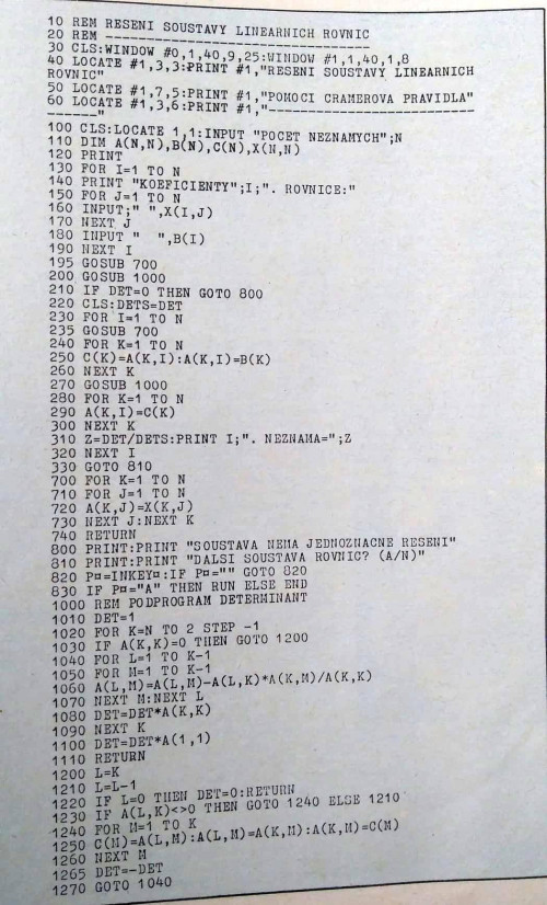 Takže si vypomůžeme a Cramerovo pravidlo nebudeme matematicky řešit, zkrátka ho jen použijeme. Já jsem našel starý program v Basicu na Atari XE/XL, v časopise VTM, který dal dohromady Ing. Karel Kulík. Je to obecně program pro řešení soustavy lineárních rovnic. Vlastně se dá říct, že to je hotový poklad!, protože máš předpřipravený skript pro řešení libovolné soustavy rovnic, tzn. pokud umíš sestavit matici - jak jsem to udělali zde, takže umíš - máš skript pro jakkoli vysoký stupeň polynomu, resp. regrese. Program funguje tak, že aproximačně (přibližně) najde za pomoci iterací (opakování) determinanty a Cramerovým pravidlem dospěje k řešení všech neznámých libovolného počtu rovnic v soustavě rovnic. Nic více, nic méně.