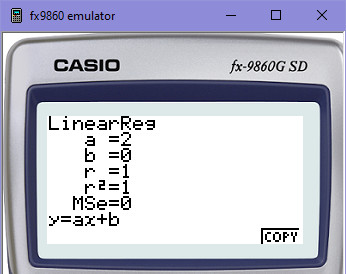 Tím jsme se dopátrali koeficientů A, B. Na kalkulačce k dispozici jsou - můžeme ověřit, ale teď už víš, jak se k nim sám dobrat. Jen pro úplnost: Údaj pod koeficienty r2=1 znamená těsnost, už jsme tenhle pojem zmínili dříve. Je to v jednotkách, takže 1=100%. Víš tedy, že těsnost (či koeficient determinace) je 100%, což znamená, že křivka, kterou jsme zvolili (lineární), proloží vstupní hodnoty na 100%, není tam žádná odchylka.
